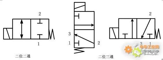 图符的方框表示电磁阀的工作位置,有几个方框就表示有几“位”。方框内的箭头表示流体处于接通状态,但箭头方向不一定表示流体的实际方向。方框内的┫ 形符号表示该通路不通。方框外部连接的接口数有几个,就表示几“通”。平时说的二位二通,二位三通,二位四通,二位五通就是根据以上来的。